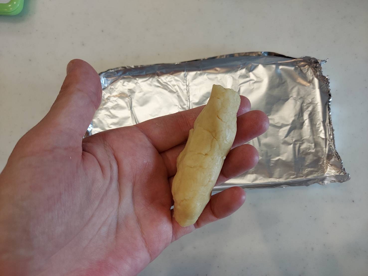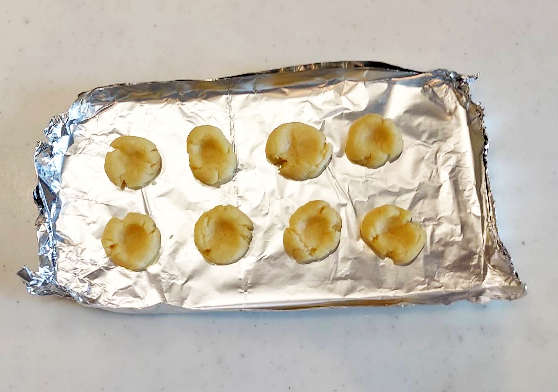 1口分ずつホイルに乗せて、軽く潰します。