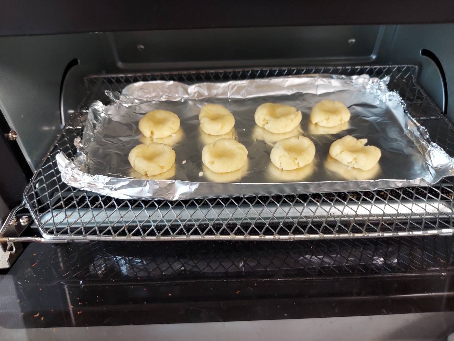 トースターで4分程度焼きます。(トースターの出力によって違うので、様子を見て下さい。我が家は800Wですが、電熱線と棚が近いような気がします)
