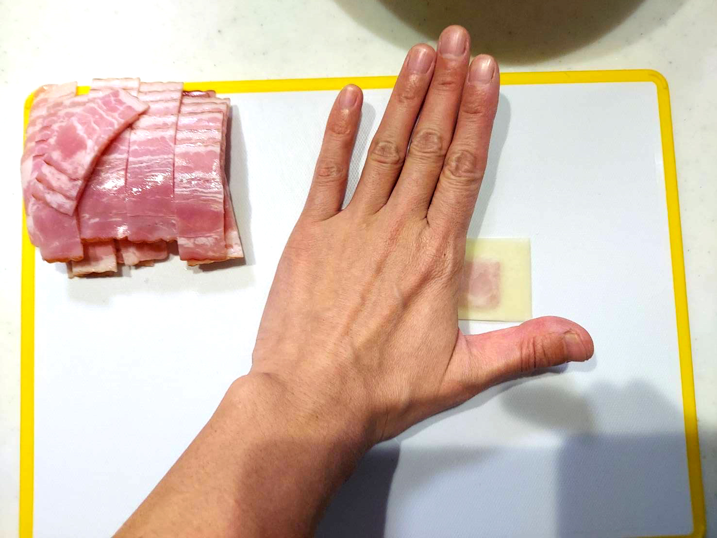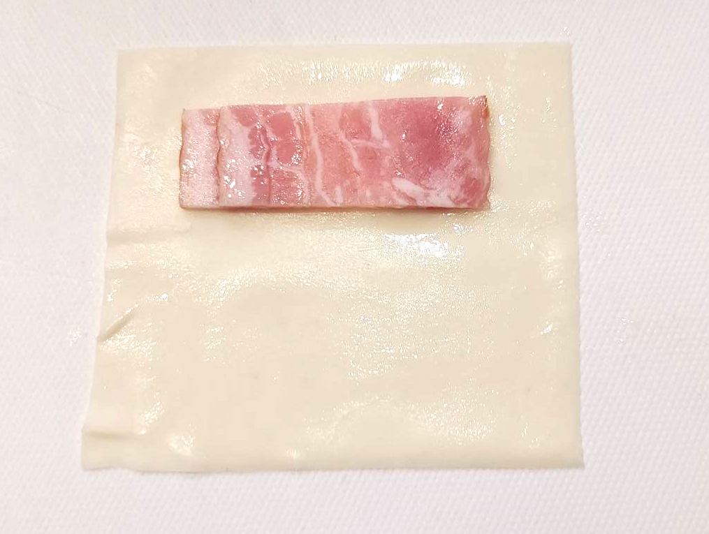しっかり押さえてくっつけます。中のベーコンが曲がったり、重ねるのがズレたりしても大丈夫。ベーコン部分が膨らむので、中身が出ないくらいのハミ出しはOKです!