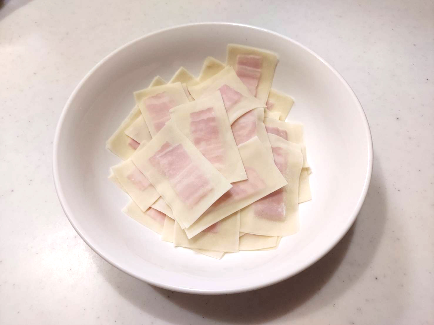 はさむものはベーコン以外でもアイデア次第でいけます。ただし、今回、ご紹介するやり方では揚げるときに開いてしまう場合があるので、中身が出やすい食材はご注意ください。