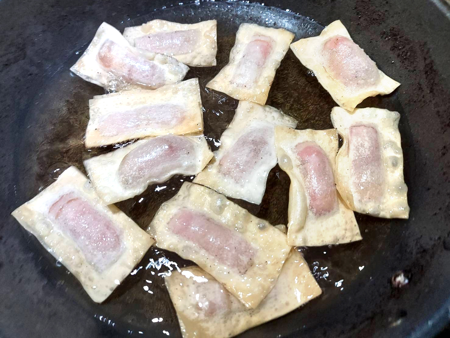 全て同じように閉じたら、揚げていきます。180℃で1~2分揚げたら裏返してまた1~2分。きつね色になる手前で取り出し始めましょう。